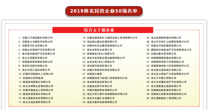 獲淮北市2019年度民營(yíng)企業(yè)排序綜合五十強(qiáng)